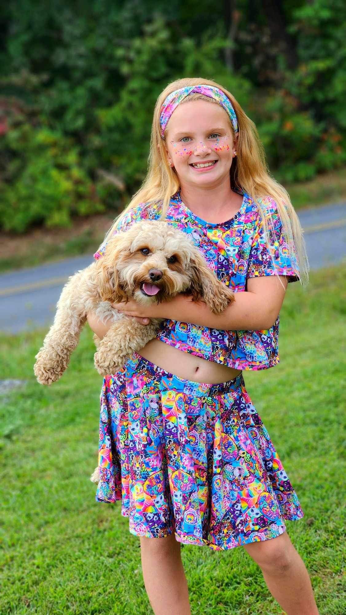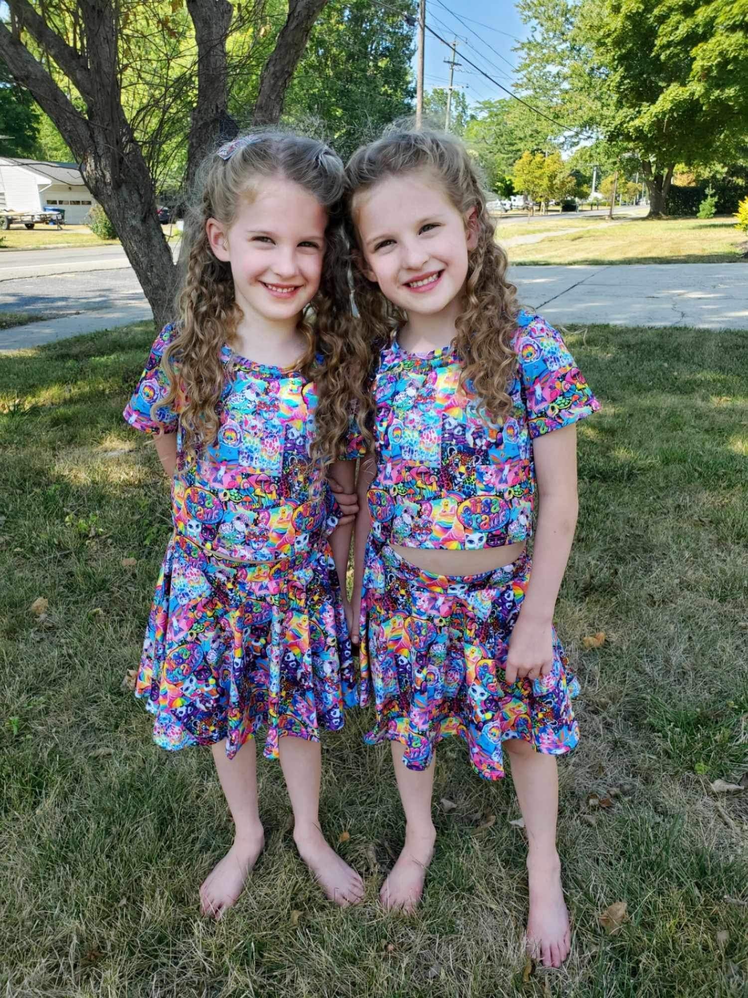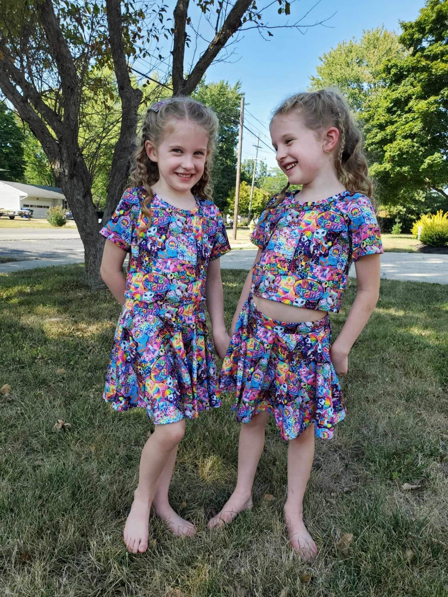 97% Cotton 5% Spandex. Baby number sizes run closer to the bigger number size (example: 12/18m fits closer to 18m) Crop set (please note this would be a “modest” crop, hitting right around the top of belly button contingent on kid’s torso length) and twirly skirt with built in shorts. Skort can be worn higher on waist if desired.