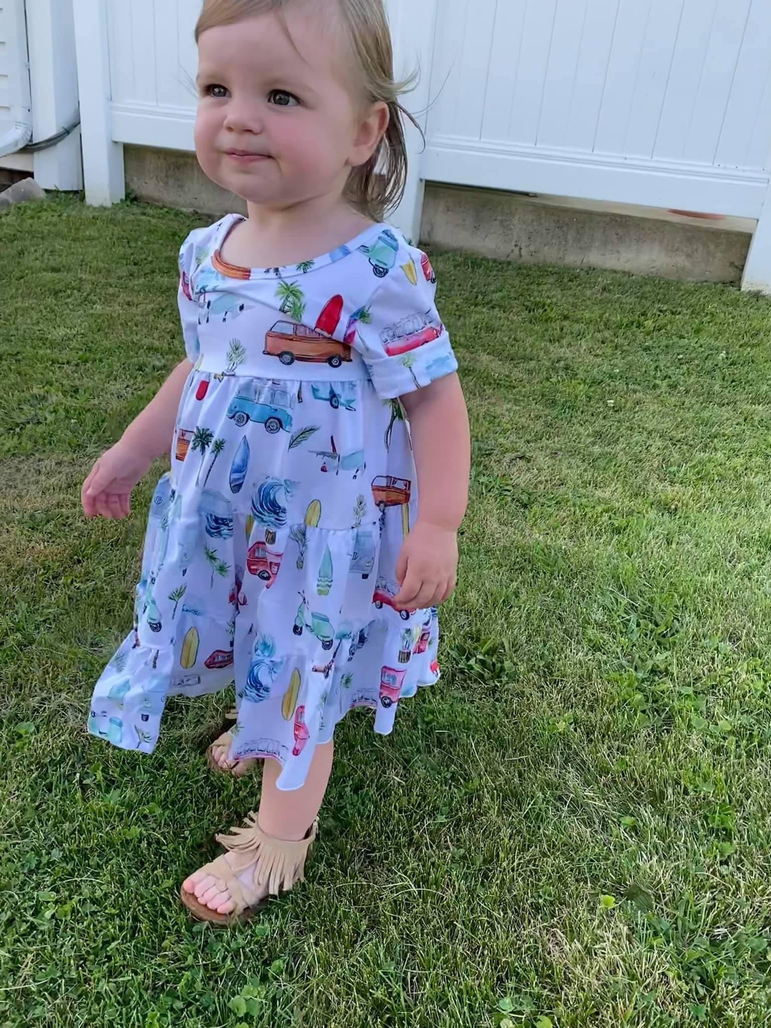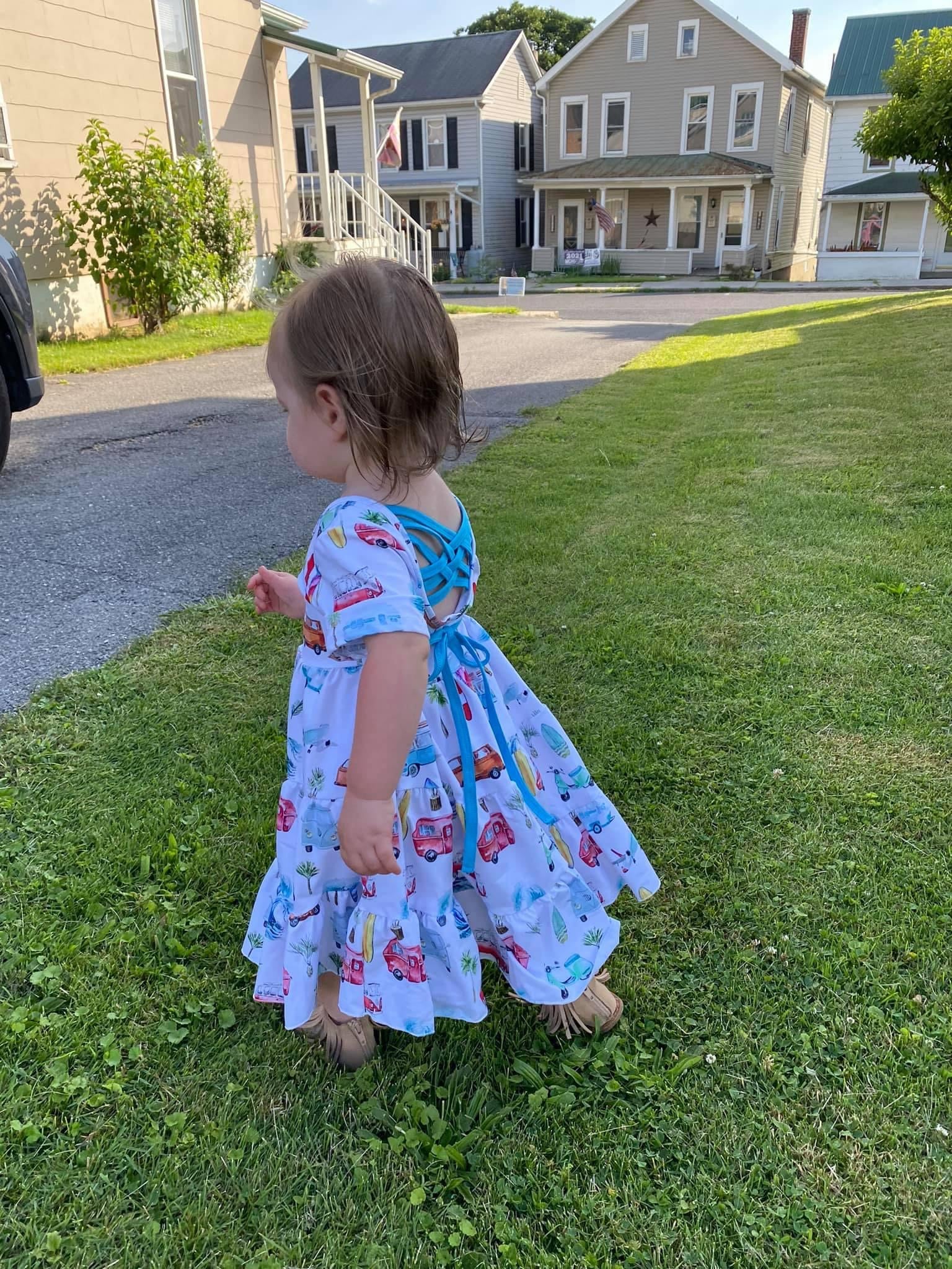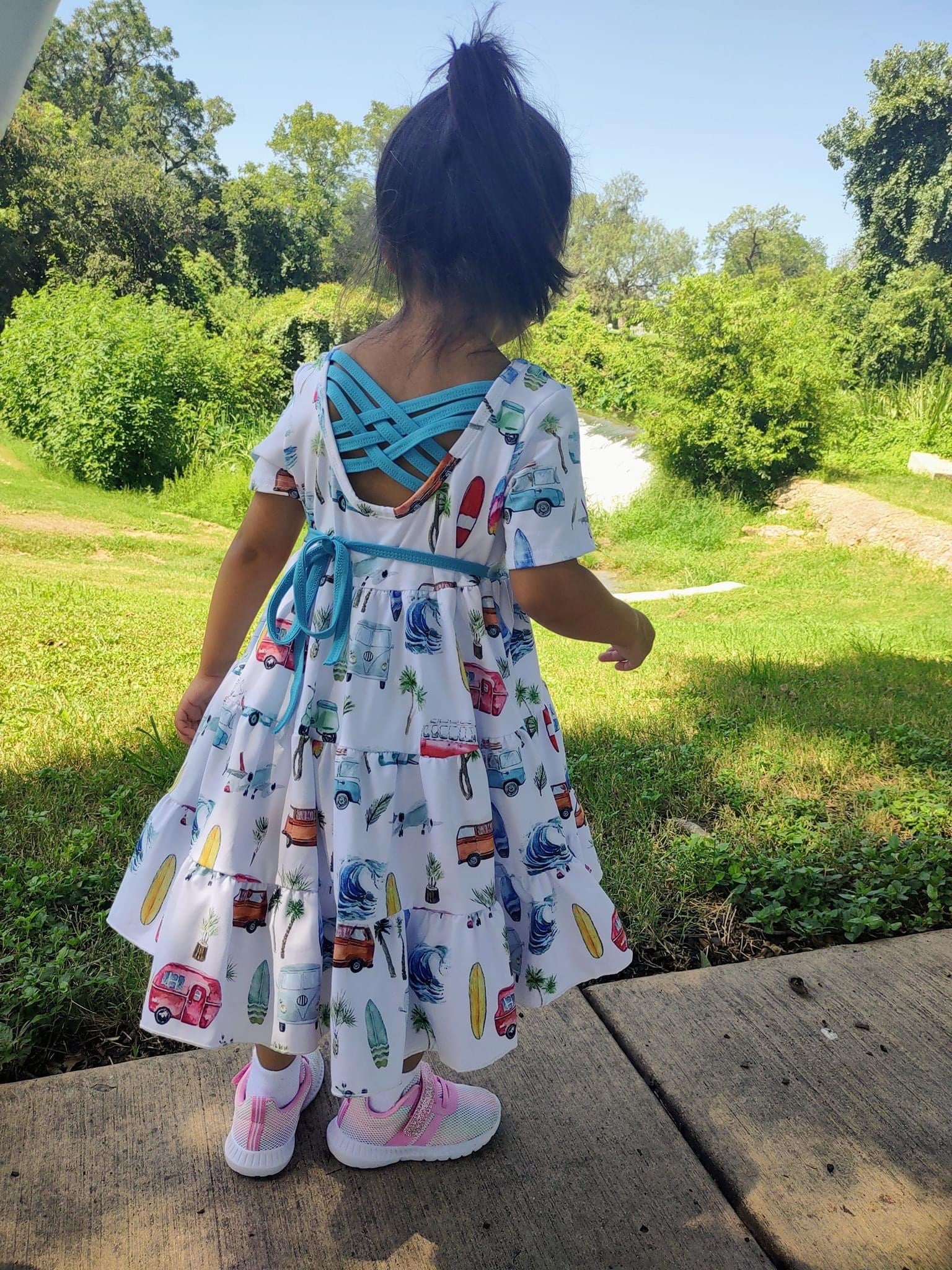 97% Cotton 5% Spandex. Butter soft material. This dress features a triple tiered dress with triple criss cross back and a simple tie that ties at the back. Baby number sizes run closer to the bigger number size (example: 12/18m fits closer to 18m)