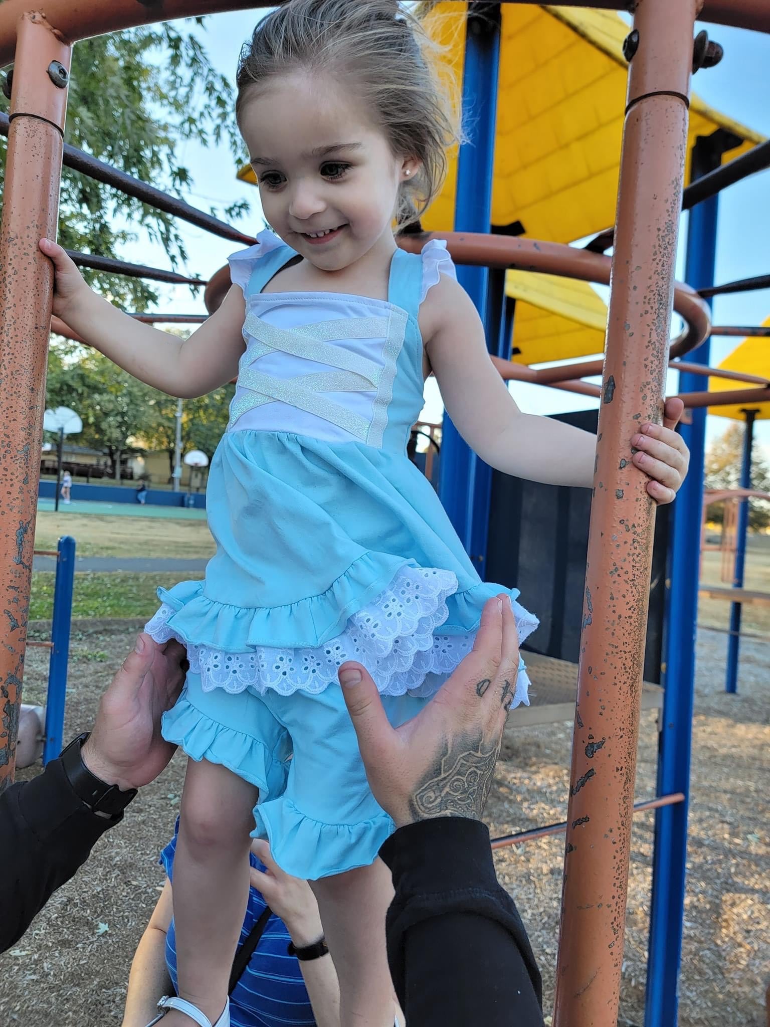 97% Cotton 5% Spandex. Butter soft material. Baby number sizes run closer to the bigger number size (example: 12/18m fits closer to 18m) The trim is glitter elastic.