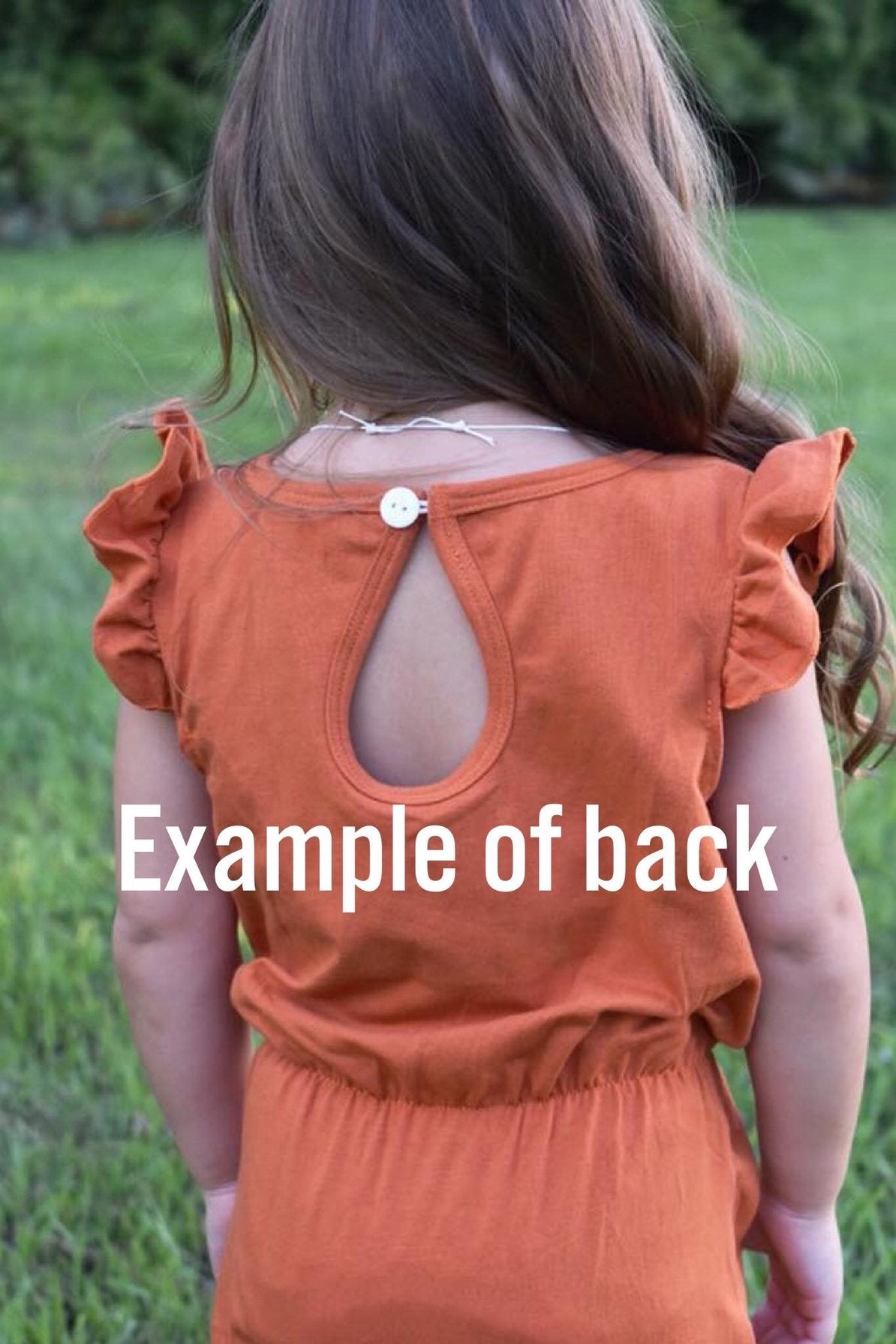 93% Cotton 7% Spandex. Butter soft material. Sizes 2T and under have snaps in the leg area for easy diaper changing. Sizes 3T and above do not have snaps. This romper features a key hole back that closes at neck area with a button. Number sizes 0/3m, 3/6m, etc. run closer to bigger number size (ex. 3/6m fits more like a 6m). Sizes 2T and up are true to size.
