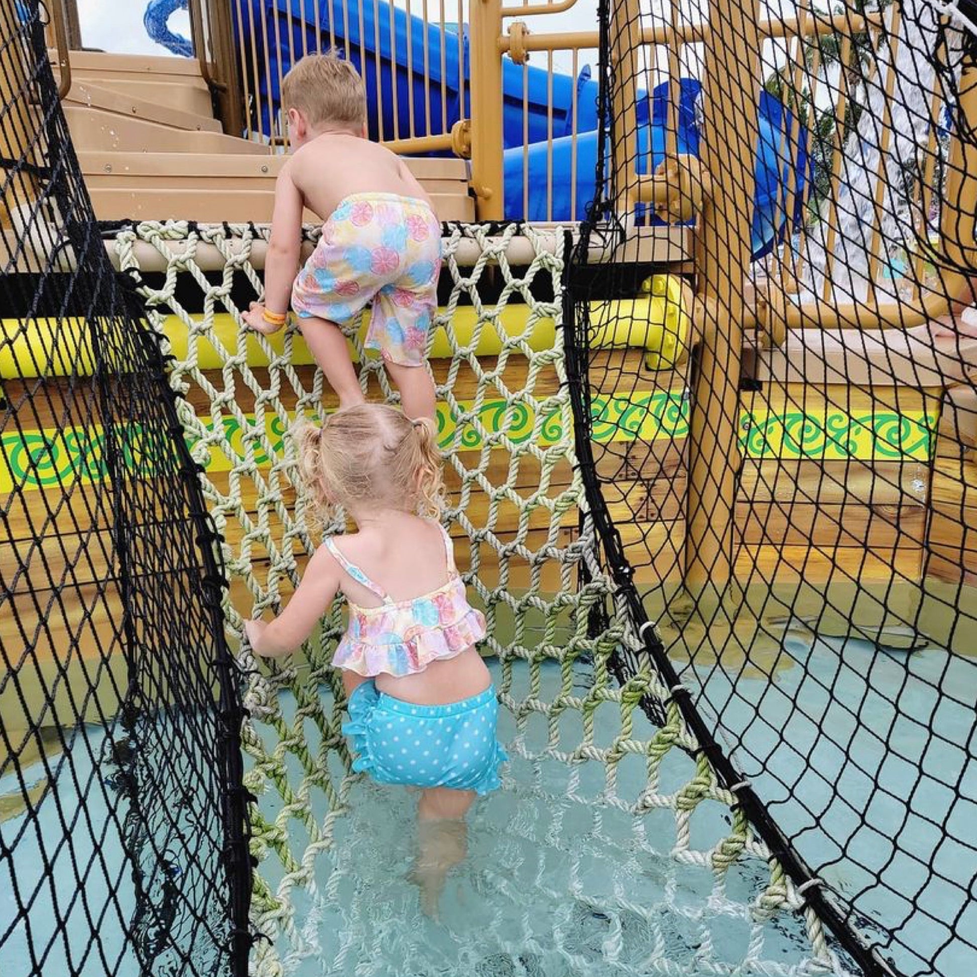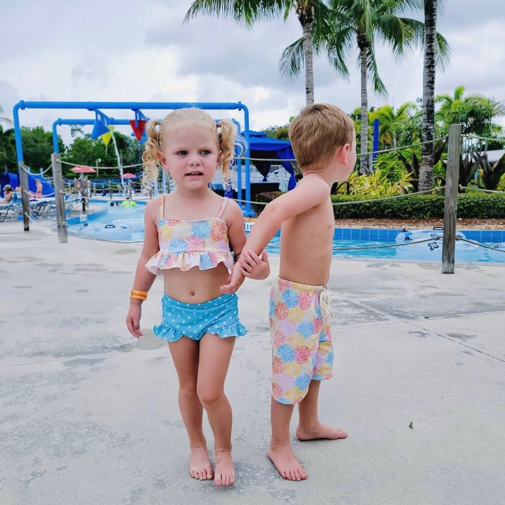 85% Polyester 15% Nylon. Swimsuit lined. Baby sizes run closer to the bigger number (ex. 9/12m fits closer to 12) Please see size chart.